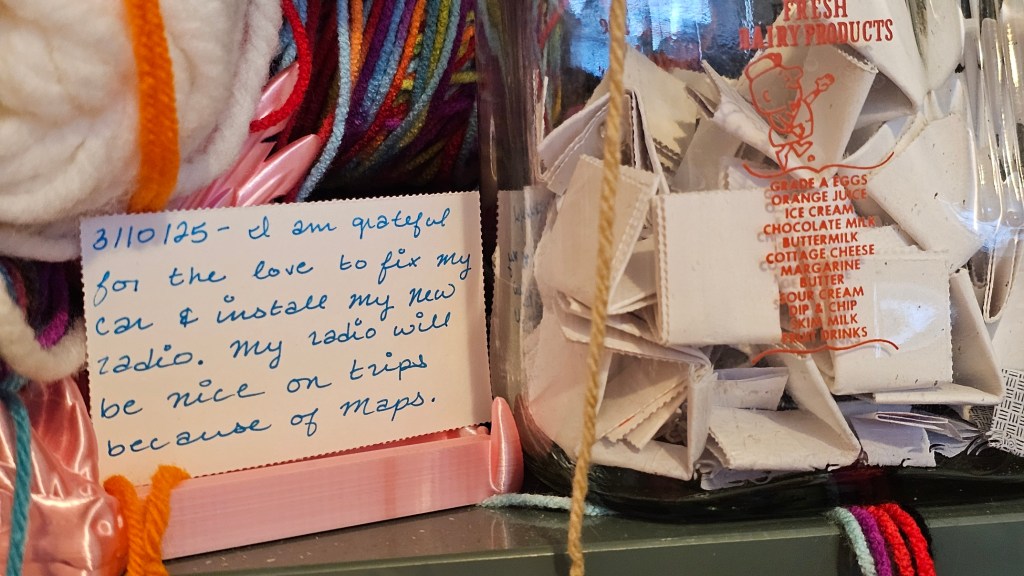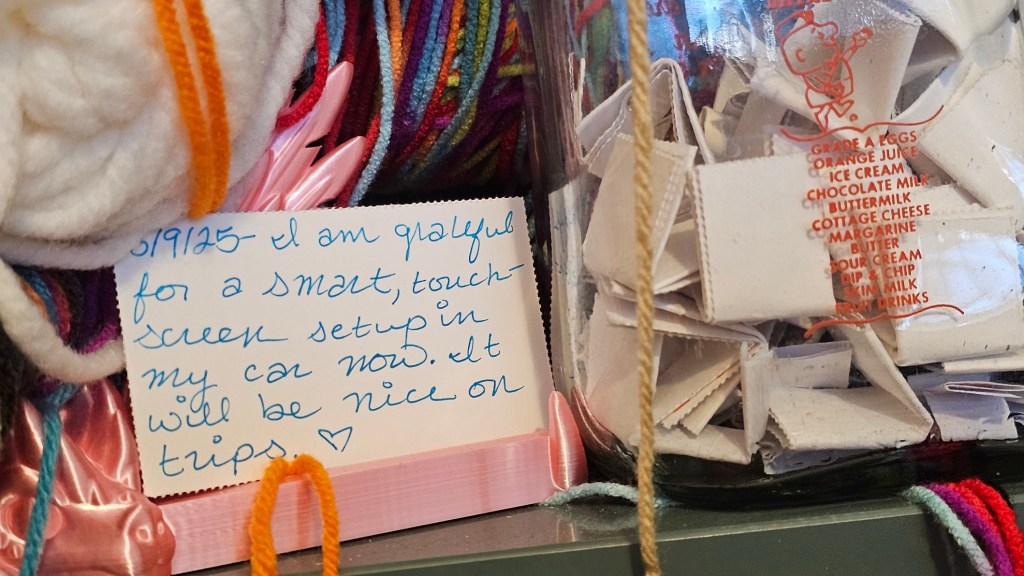 I am grasping at straws for gratitude, lol. I’ve been feeling stressed and overwhelmed. As a matter of fact, yesterday I burst into tears out of sheer overwhelm. I had 2 people telling me what and how to do things with my new radio instead of letting me figure it out. Then, I had repeat phone calls from family. I am connecting my phone with the radio they installed to test it when I get another call from family. M left to go do other things while my better half continued helping me. None of my radio stations I love were working and I couldn’t figure out why it had half stations (i.e. instead of 106.1, it would say 106.10 or 106.15).